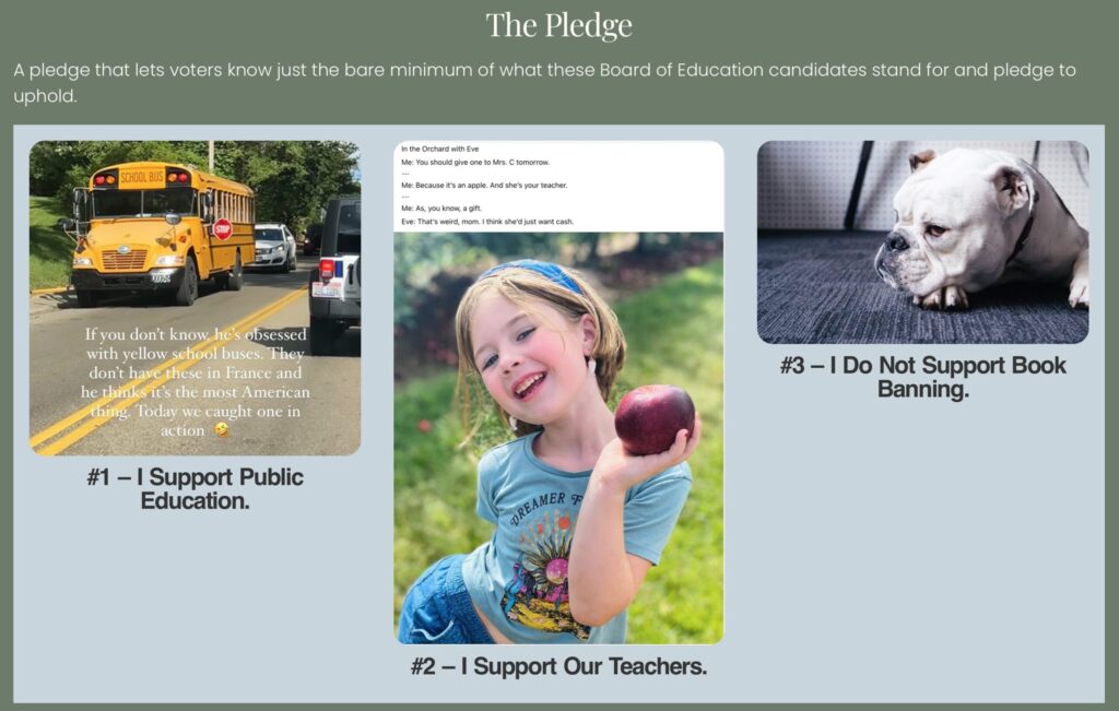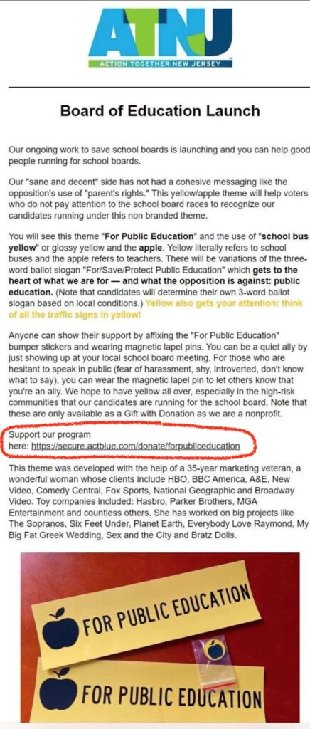 She has teamed up with far-left radical organizations that use children and hidden pledges to undermine parents & push their ideology on other people’s children in the guise of an “education” and accepting political partisan donations during an “apolitical” BOE campaign, for example Actblue.com.